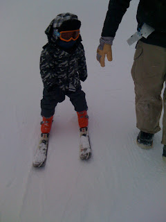 Here Henry is on his new "fast" skis trying them out for the first time. I'm running along/snowboarding taking photos and throwing out words of encouragement while Ben is hands on picking Henry up when he falls, giving instructions, and trying to teach him to turn/snowplow, and just being a general comfort to Henry by running along side offering a hand just in case he needs it.